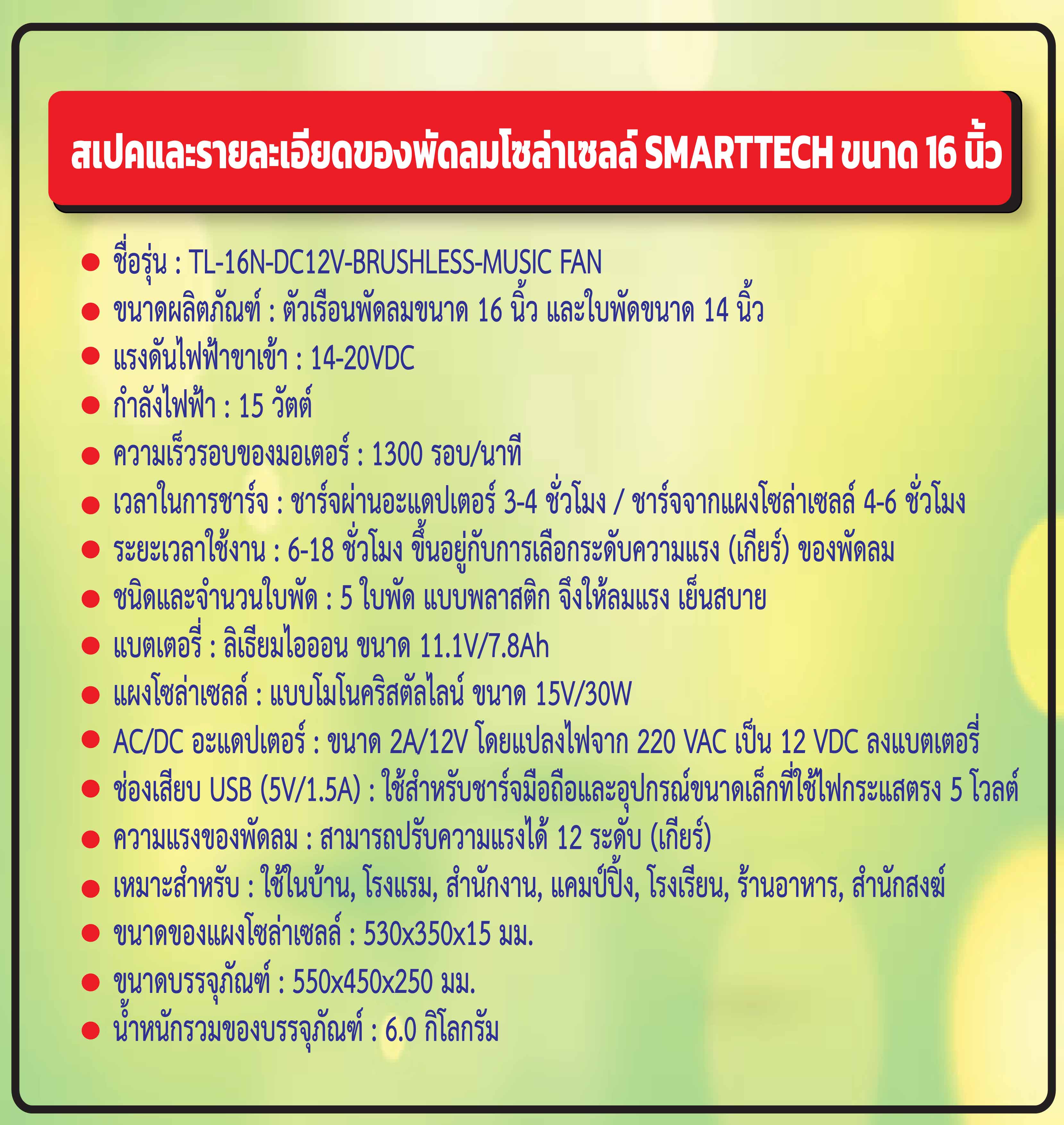 พัดลมโซล่าเซลล์ ขนาด 16 นิ้ว รุ่น TL-16N-DC12V-BRUSHLESS-MUSIC FAN